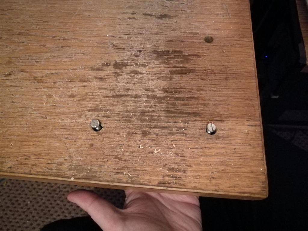 Since I didn't have any 5mm nuts around that had a surface bigger than the bolt holes (or any suitable washers) I just drilled a piece of scrap MDF to put under the bench and put the bolts through.